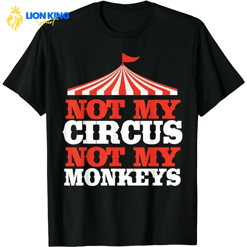 The “Not My Circus, Not My Monkeys Shirt” plays on the idiom “not my circus, not my monkeys” about avoiding unnecessary problems. This humorous phrase refers to staying out of other people’s chaotic or problematic situations. The shirt features a cartoon scene at the circus. Monkeys are seen waving from the top of a circus tent in the background, about to fall off and potentially cause devastation. Meanwhile, other relaxed animals like elephants and lions enjoy the show from the stands. Animal lovers and fans of idiomatic wordplay will 1appreciate this funny spin referring to both literal monkeys and the well-known idiom.